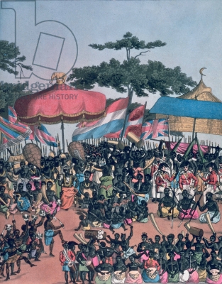 Thomas Edward Bowdich, 1817, an Asante/Ashanti home with the Nyame Dua–G-d’s Tree altars, near a silk-cotton tree–this is where part of the yam would be offered during the Akan New Yam Festival. The Asante by family custom/oral history–are some of my ancestors.