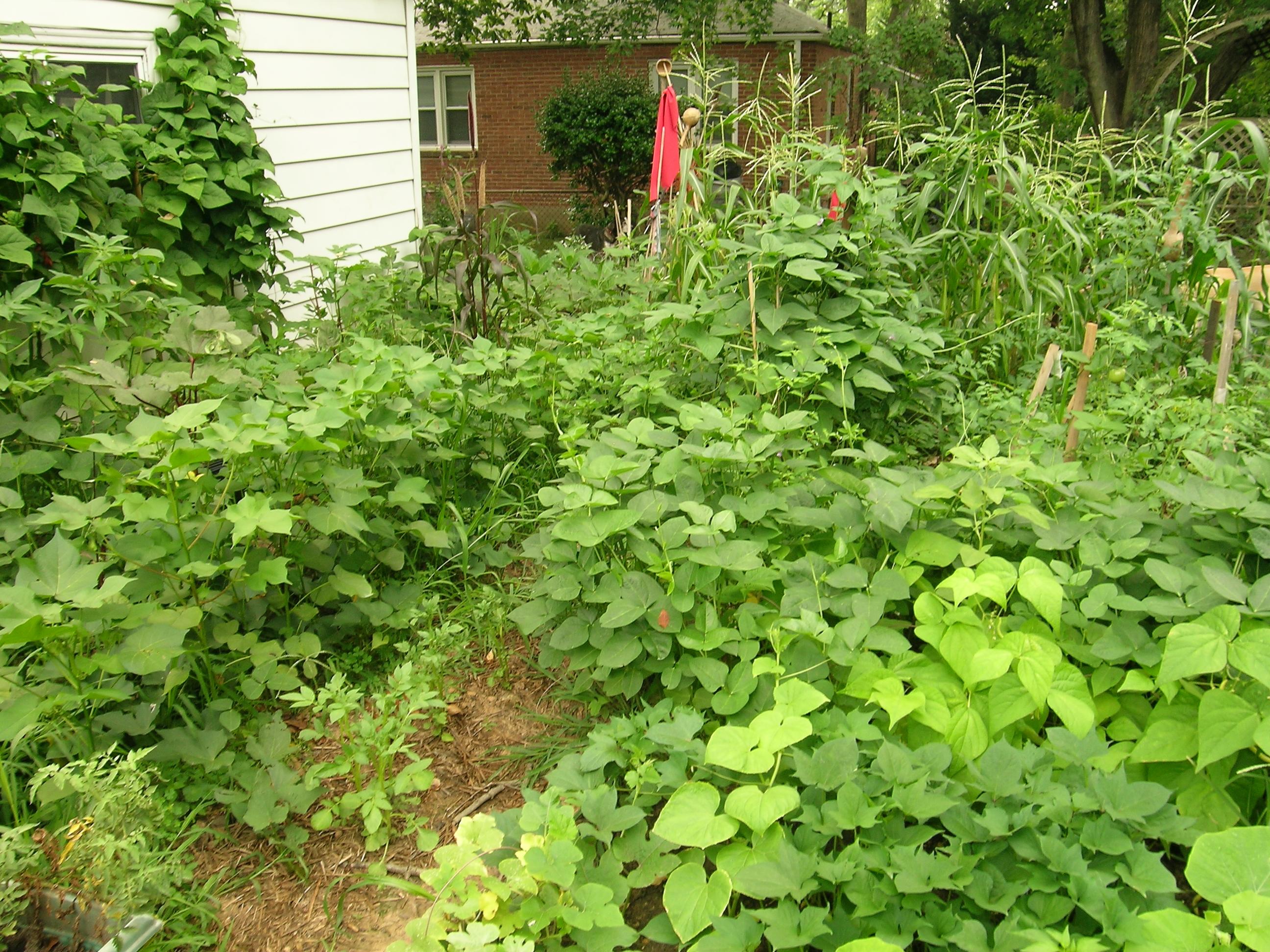 The year I did a West African multicrop/mulitculture garden–sweet potatoes are at the bottom right of the picture…