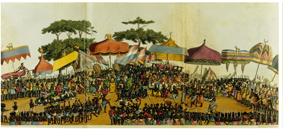 Credit: This image is from the fantastic Ross Archive of African Images through Yale..this a beautiful painting depicting the New Yam Festival in the early 19th Century in what was one of most powerful kingdoms in West Africa, the Asante State, partly built by gold, partly built through slavery and war and other forms of trade. Even though the wars with other peoples caused many to go into slavery, families like mine have Asante ancestors who themselves were enslaved by other ethnic groups challenging the Asante rise to power. To us, slave trade wars were WWI and WWII rolled into one–a very unfortunate part of our development as a people. Note the twirling of umbrellas and flags and parading and drumming–and think about the famous “second line” of New Orleans funerals and Mardi Gras celebrations. Note the snake, the chicken, the elephant and the moon (the latter possibly borrowed from Islamic iconography); common symbols that we still have in our homes and aesthetics and folklore as Africans in the Diaspora.