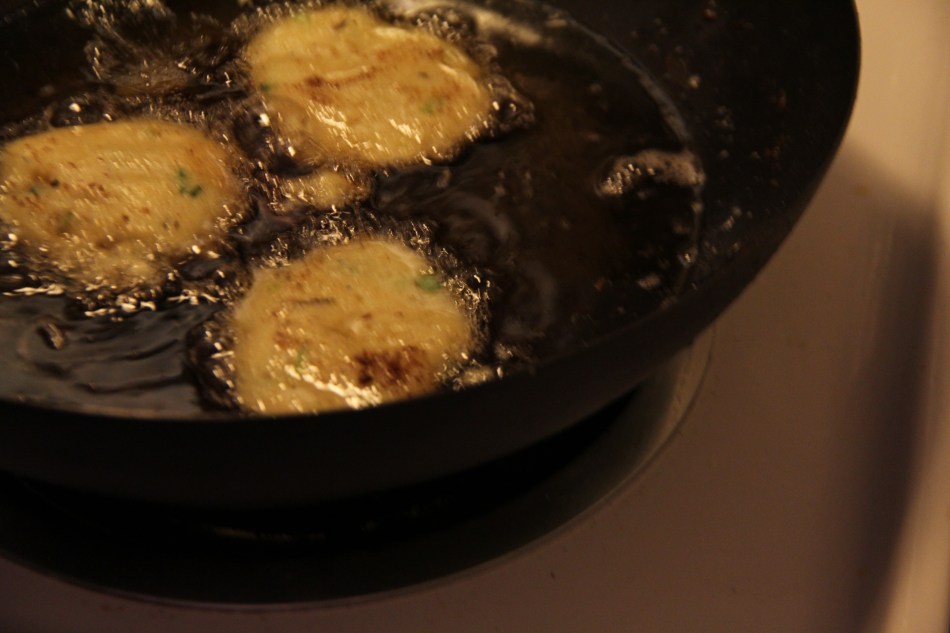 - In a large heavy-bottomed skillet over medium-high heat, heat the oil until hot. Most recipes call for between 350-375 degrees. Place a heaping tablespoon and a half of the potato mixture into the hot oil, pressing down on them to form 1/4 to 1/2 inch thick patties. Brown on one side, turn and brown on the other. Let drain on paper towels. Serve hot with an extra dusting of hot pepper and a few slices of green onion. Dips: applesauce, sour cream, and maybe some sweet chili sauce (sugar, vinegar, salt, garlic, chili, pepper).