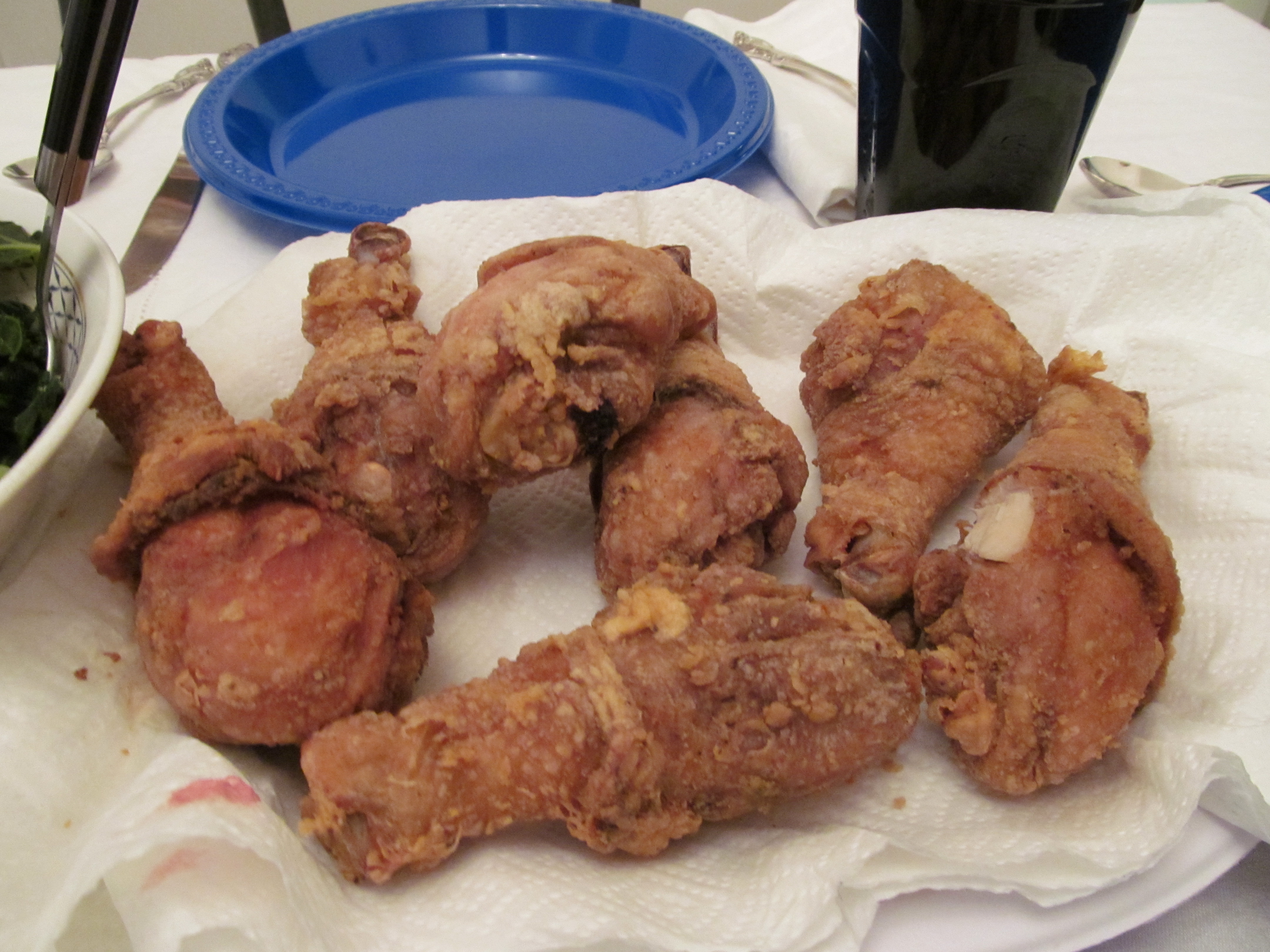 Fry around 8 minutes a side and turn to brown all around another four minutes per piece. Use your best judgement–crispy and golden brown on the outside doesn’t mean done on the inside. To test, you should aim for 160 or above for white meat and at or above 175 for dark meat. The appearance of the chicken and the doneness of the meat inside are the two factors you have to balance when frying chicken. There is no exact formula so have an oil thermometer handy, a meat thermometer handy, and use your eyes, ears, and nose to do the rest of the work. Use TONGS not a fork to deal with the chicken. Want to gauge a good color for chicken? Try this: