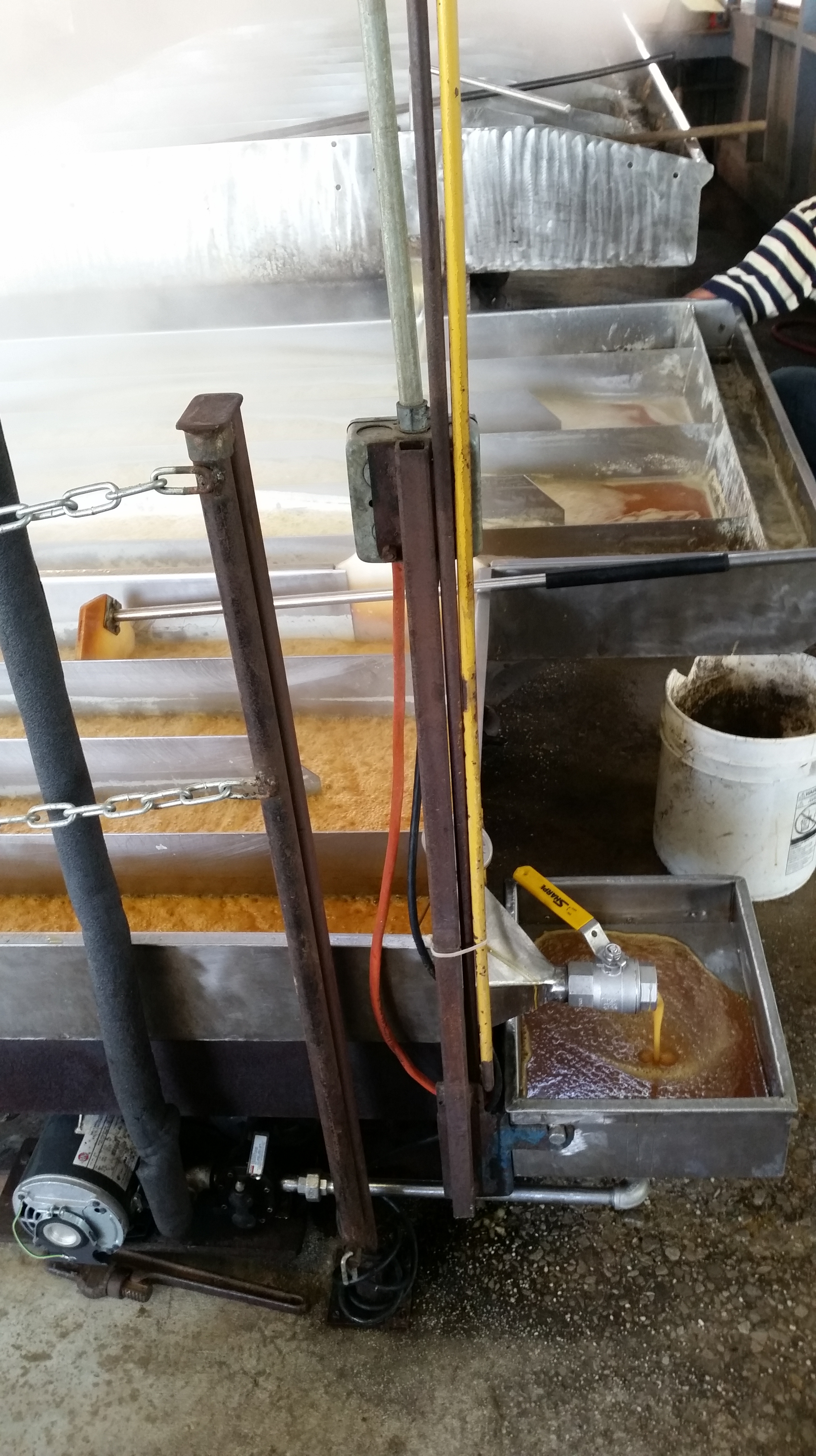 The juice is strained and collected until it goes into a steam heated series of vats where voila,  30 minutes later it thickens into sorghum syrup.