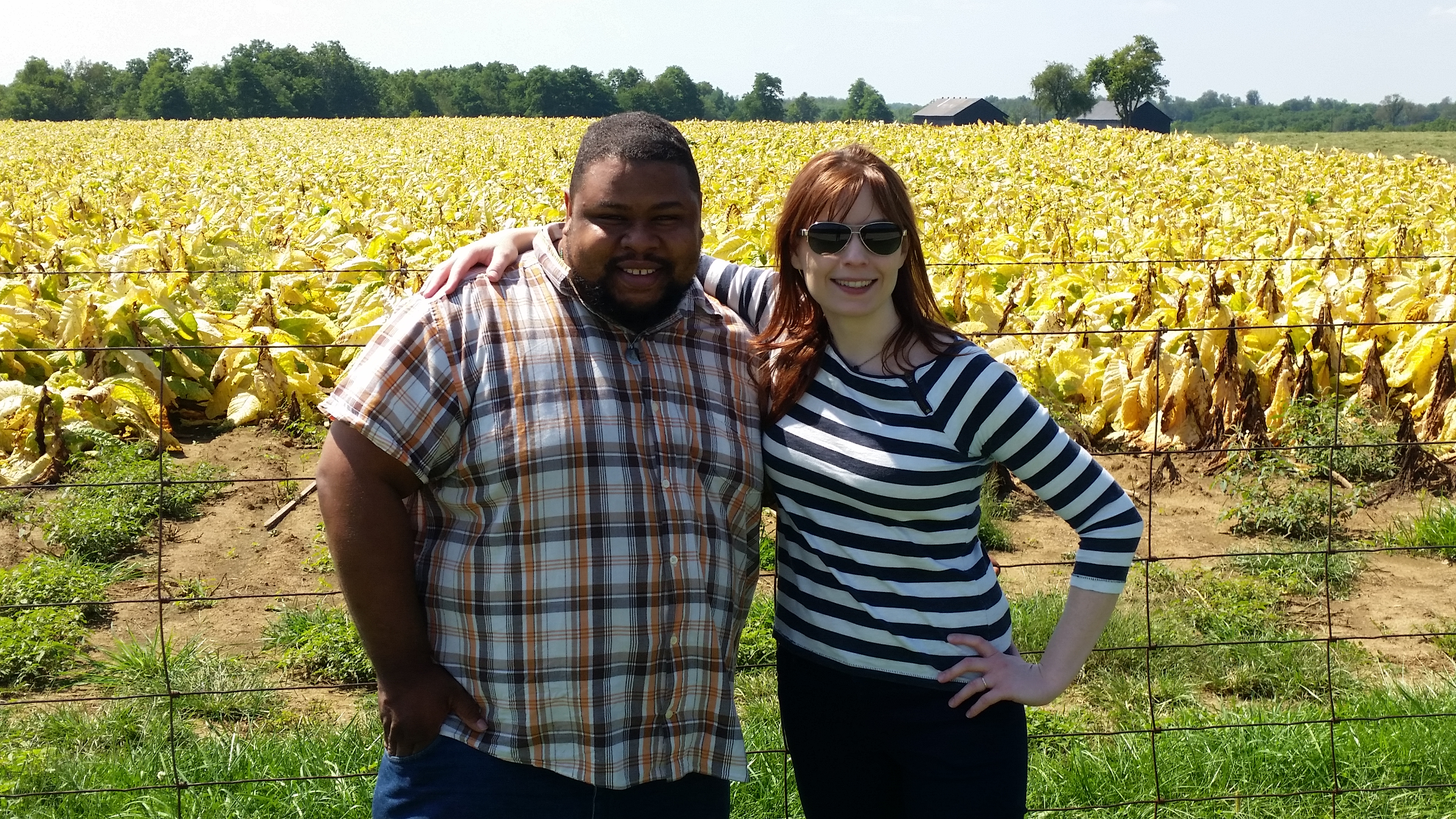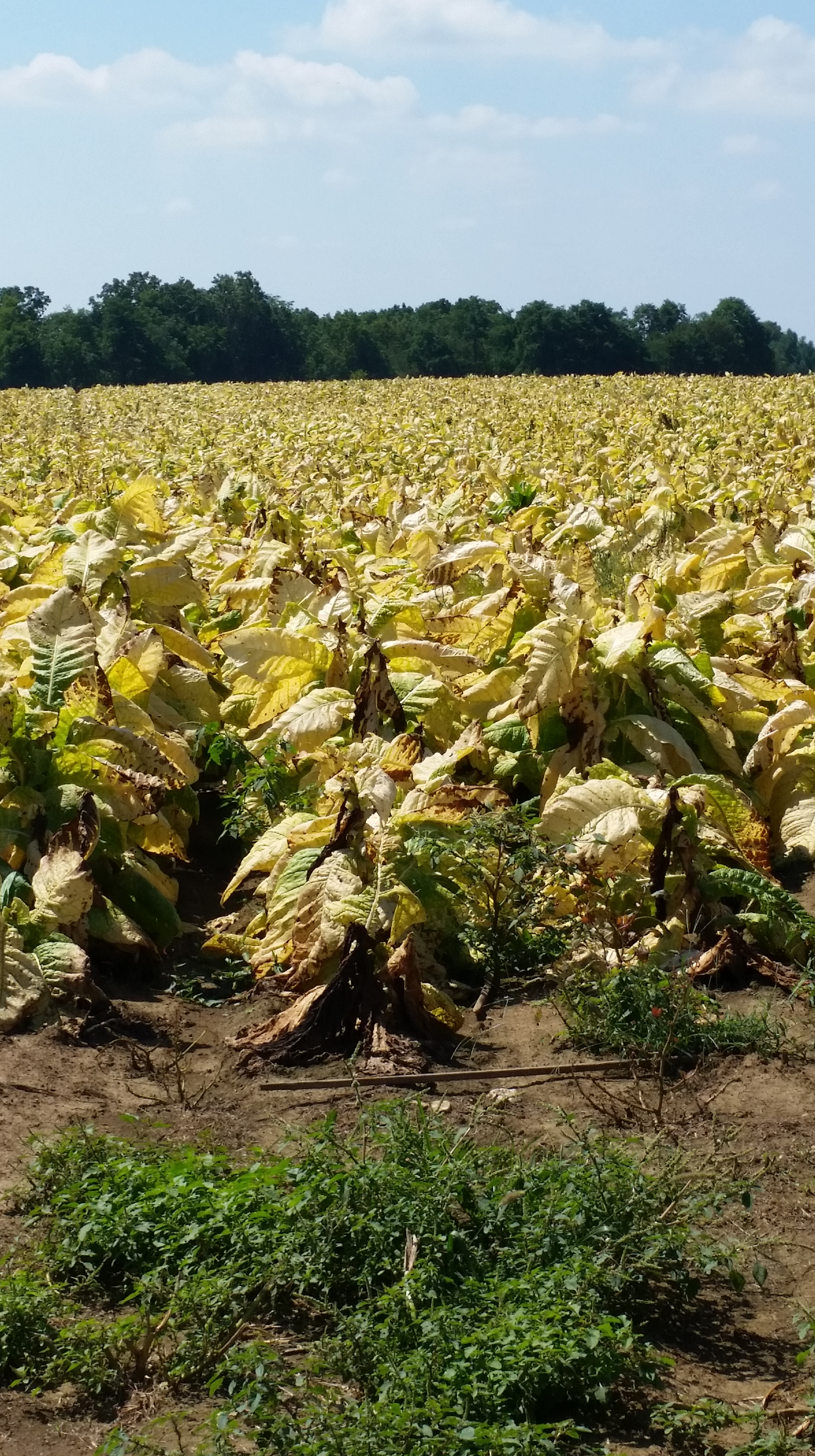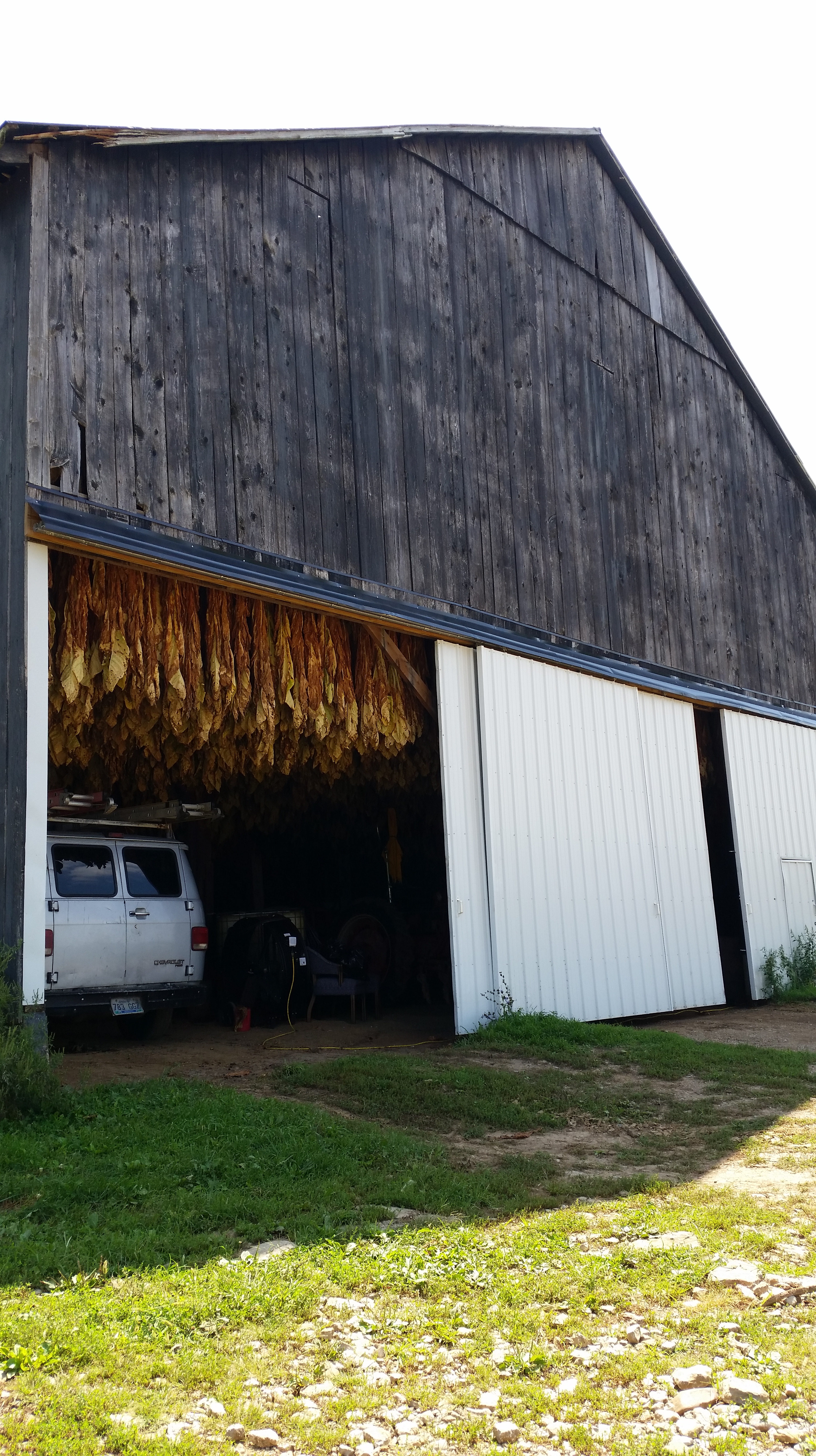 Tobacco, corn, rye, and hemp were major crops in Kentucky during slavery time. Much of the rye and corn were transformed into whiskey.  70% of the nation’s burley tobacco crop is grown in Kentucky, with smaller amounts being grown in Tennessee, North Carolina and Virginia.  As I traveled from Virginia into Tennessee and Kentucky,  the late summer fields of brilliant,  blinding golden leaves curing in the sun set themselves apart from the emerald bucolic face of the hills and the pale blue skies above.  The black roofed barns slowly swallowing the harvest swelled with stakes of cut plants, emitting an acridly sweet mustiness each time the breeze gave life to the leaves and pushed it’s way through the open slats used to impregnate the crop with dew.  The leaves go from crumbly to a leathery pliable texture.
