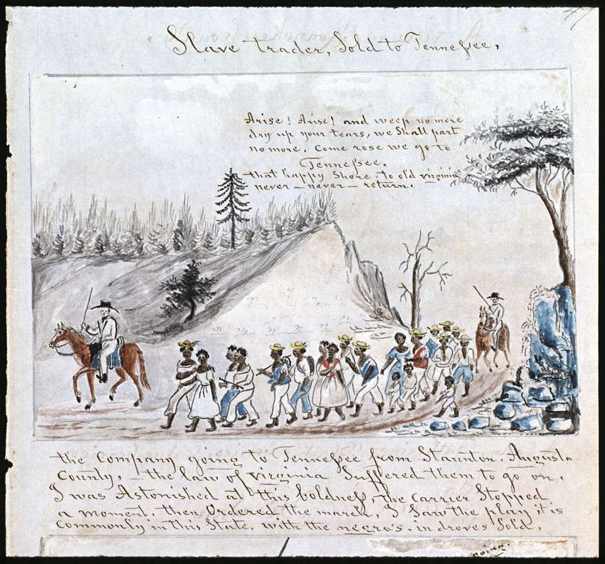 19th century artist, Lewis Miller's rendering of enslaved people being marched from Staunton to Tennessee.