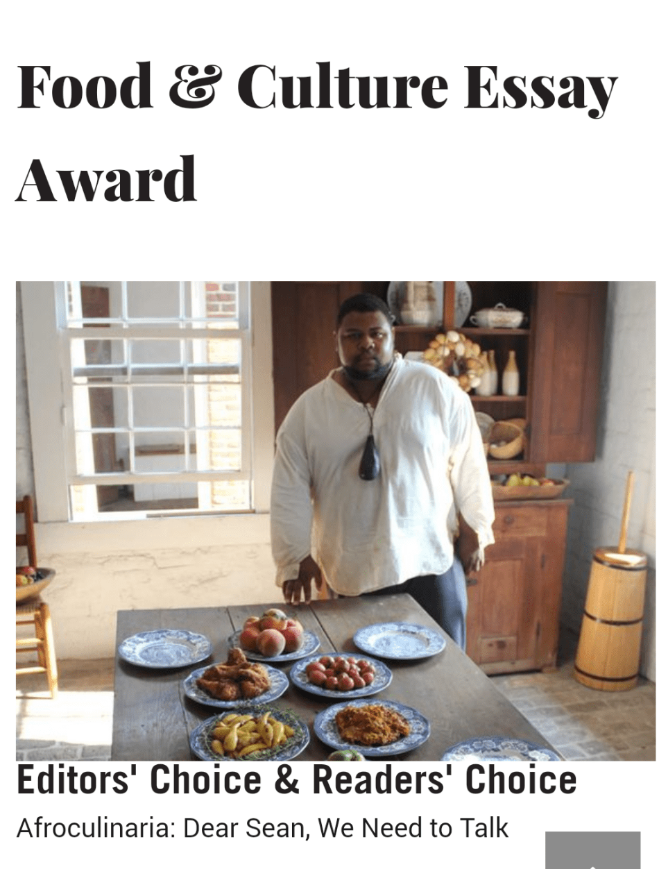 As many of you know I was nominated for the category of Food and Culture Blog. 30,000 nominations across a dozen or so categories were whittled down to just a handful, and of 6 total finalists, your votes led to our being chosen the best food and culture essay.. In fact Afroculinaria won both Editor’s and Reader’s Choice for “the best single piece of food writing and cultural commentary.”