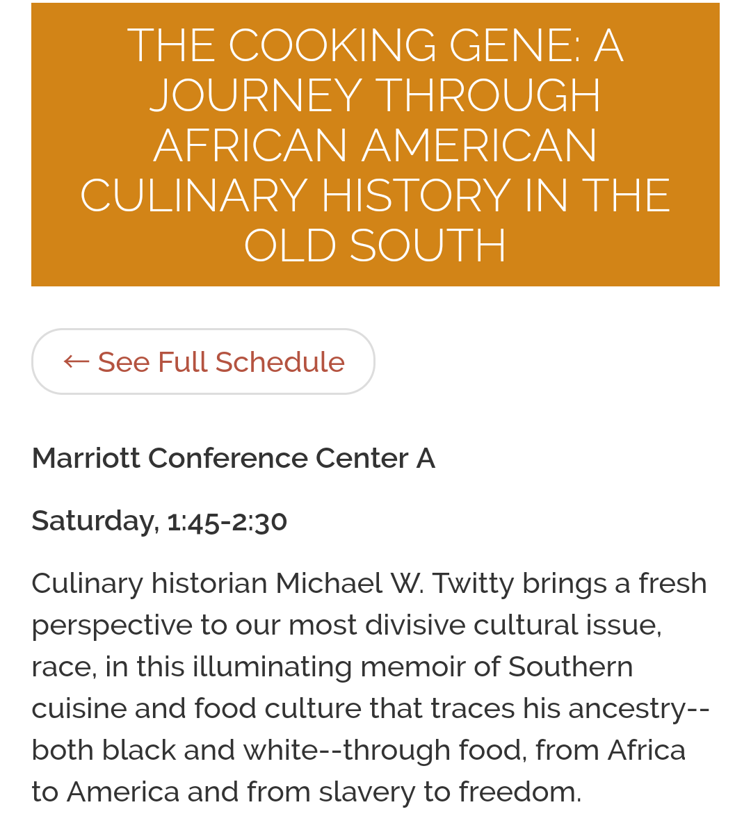 African American Food History Diaspora Food Culture Events and Appearances The Cooking Gene AJC Decatur Book Festival | The Cooking Gene: A Journey Through African American Culinary History in the Old South by michaelwtwittySeptember 1, 2017 Comments 0 https://www.decaturbookfestival.com/sessions/view/594b2fde81229a5fb60ca5dd Come see me in Atlanta this weekend at the Decatur Book Festival. I will be signing books! Share this: Click to share on X (Opens in new window) X Click to share on Facebook (Opens in new window) Facebook Click to share on LinkedIn (Opens in new window) LinkedIn Click to share on Reddit (Opens in new window) Reddit Click to share on Pocket (Opens in new window) Pocket Click to email a link to a friend (Opens in new window) Email Click to print (Opens in new window) Print Like Loading... 0 comments on “AJC Decatur Book Festival | The Cooking Gene: A Journey Through African American Culinary History in the Old South” Leave a comment Cancel reply Δ Post navigation Previous Post Next Post