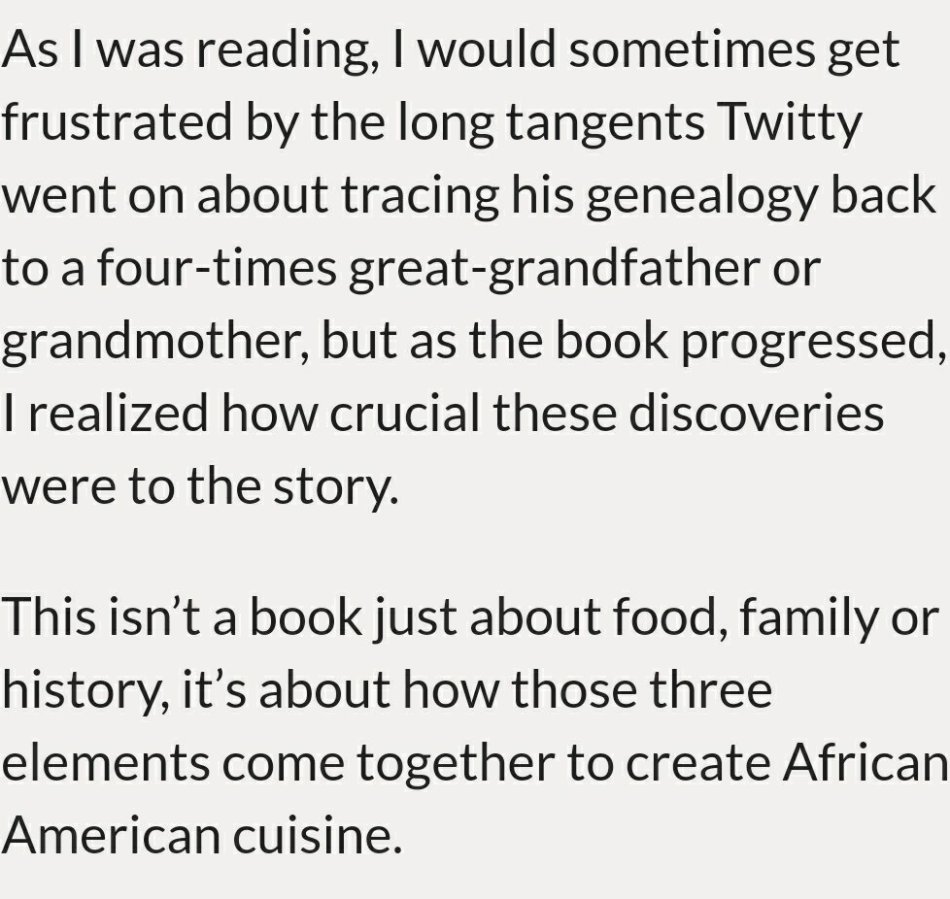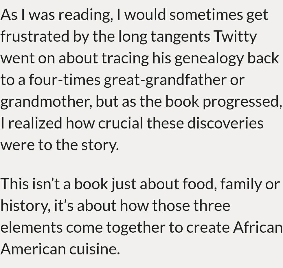 The knowledge of our Ancestors and our stories is critical to the true history of our food. Writing about one’s genealogy is not easy but she got exactly why I did it. That meant a lot, it was a sign of a true critical reader who stuck with a dense text.
